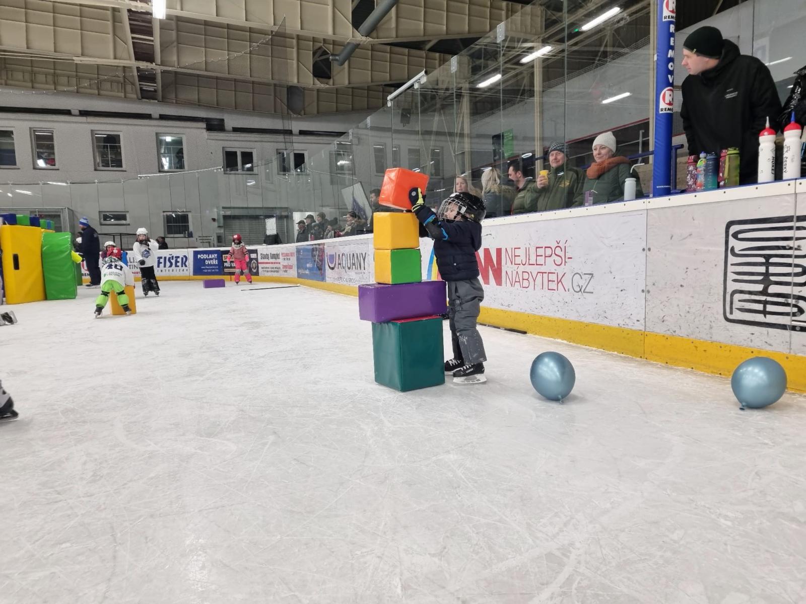 Na ledové ploše si děti vyzkoušely formou stanovišť střelbu, projet opičí dráhu, zahrát si hokej a ti úplně nejmenší si hráli v postaveném hradu z barevných kostek. Hokejovým nováčkům pomáhali i hráči dorostu, kteří byli zapojeni do programu Týdne hokeje.