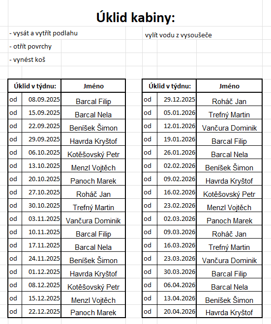 Kabinový příspěvek je 1000 Kč/sezona (platí se od září do června).