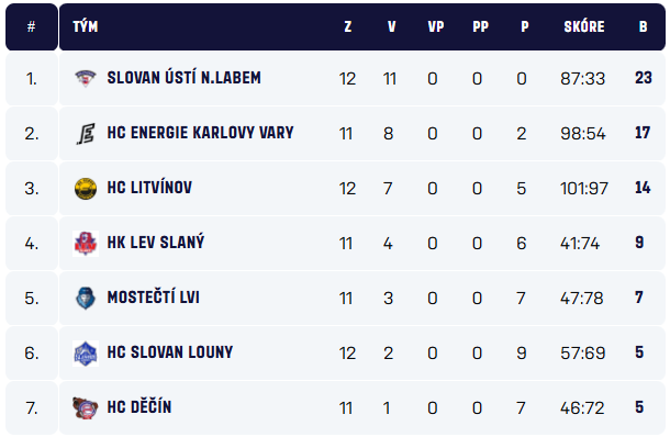 | 2. | HC Slovan Louny | 19 | 90:109 | 30 |